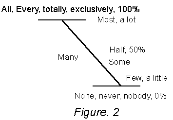 The gradient can allow the exploration of degree within language and give students more choice and flexibility in their speech. To recap, Absolute levels are either all or nothing (Fig.1). Analogue, by degree has however, a theoretical infinite number of steps in a gradient between limits(Fig.2).