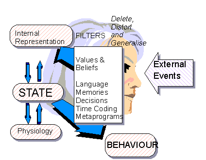 When something happens outside of us (external event), we take in information through our five senses - what we see, hear, feel, smell and taste. We then filter that information to create our own internal representation of that event. This internal representation affects our emotional state. At the same time it affects our body's physiology, including our body language. This all then becomes the driving force for our behaviour.
